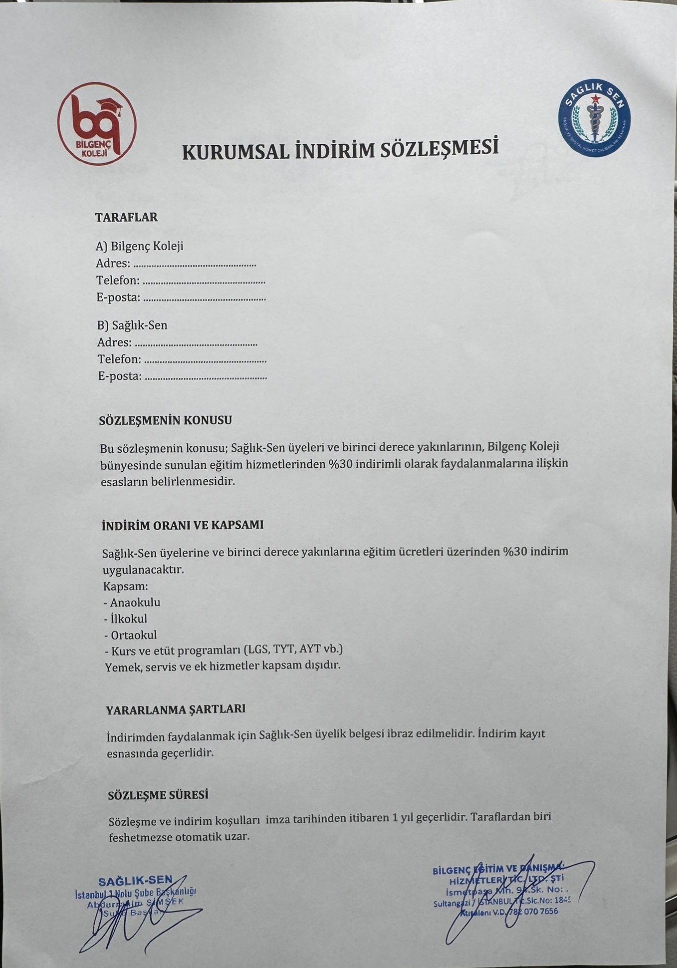 Sağlık-Sen İstanbul 1 Nolu Şube Başkanlığımız ile Bilgenç Koleji arasında yapılan anlaşma kapsamında, üyelerimiz ve birinci derece yakınları için önemli bir eğitim indirimi sağlanmıştır.